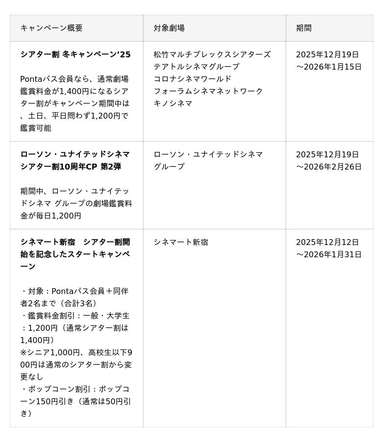 ・「シアター割 冬キャンペーン’25」:2025年12月19日から4週間(松竹マルチプレックスシアターズ/テアトルシネマグループ/コロナシネマワールド/フォーラムシネマネットワーク/キノシネマ)