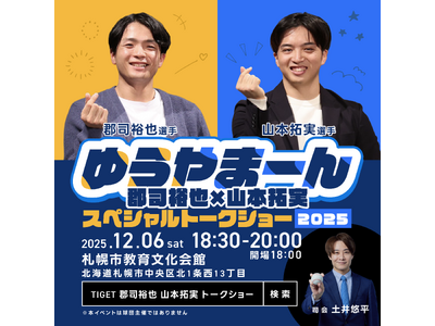 郡司裕也氏と山本拓実氏によるスペシャルトークイベント「ゆうやまーん 郡司裕也×山本拓実 スペシャルトークショー2025」が、2025年12月6日(土)に札幌市教育文化会館 大ホールにて開催されます。チケットは、TIGETにて抽選応募受付中です。