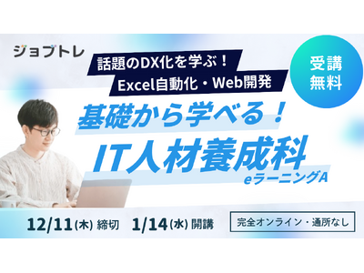 ワークキャリア株式会社(所在地:東京都港区、代表取締役:秋吉 正樹)は厚生労働省から認定を受けているeラーニング型の求職者支援訓練にて、1月14日(水)より開始する「基礎から学べる!IT人材養成科(eラーニングA)」の受講生を募集します。このコースでは、Excelの自動化を図れるマクロ・VBAを通して、プログラミングの基礎を学んでいきます。