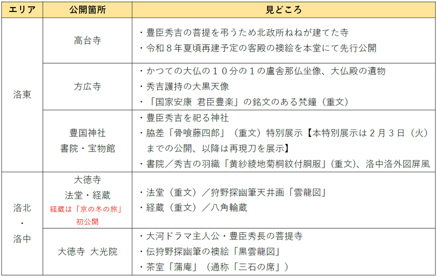 昭和42年1月に始まった本企画は、令和8年に第60回を迎えます。今回は、大河ドラマ「豊臣兄弟!」の主人公・豊臣秀長と兄・秀吉ゆかりの地をテーマに、15件の貴重な非公開文化財を特別公開します。また、定期観光バスやタクシーで巡る特別コースのほか、京都の歴史や文化をより深く楽しめる体験プラン、60回記念の特別企画など、多彩で充実した内容で展開します。