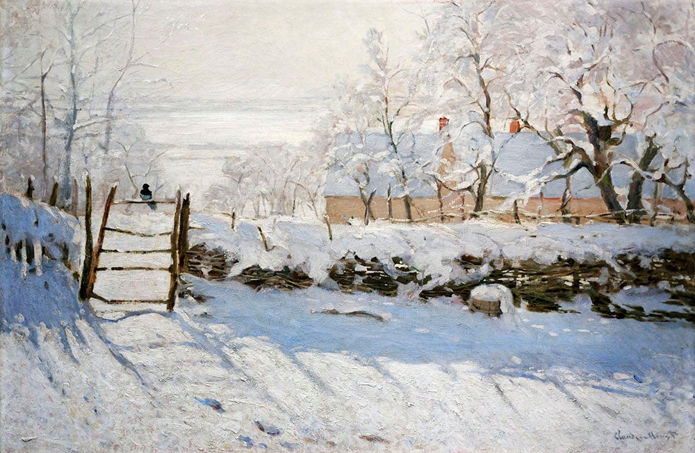 2.クロード・モネ「静けさと明るさを演出する色彩」 印象派の巨匠モネの描く雪は、単なる白ではなく、青やピンクを含んだ豊かな色彩が特徴です。中でも人気が高い『かささぎ』は、雪の上の影の美しさが際立ち、冬の静けさと明るさを同時に演出できる、まさに冬のインテリアにおける鉄板の作品です。