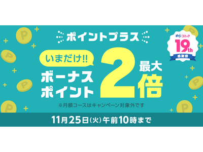 めちゃコミック(めちゃコミ)」において開催中の「19周年記念」キャンペーンの一環として、様々な人気作品を日替わり24時間限定で、全話無料で読めるキャンペーンを11月21日(金)10:00~11月25日(火)09:59で開催いたします。また、同期間において「ポイントプラスボーナスポイント最大2倍キャンペーン」も実施いたします。この機会に是非様々な人気作品をお楽しみください。