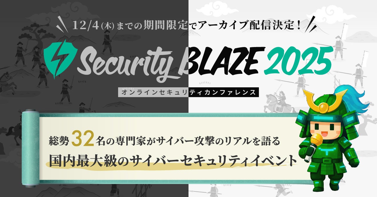 サイバーセキュリティ製品・サービスを提供する株式会社網屋(東京都中央区 / 東証グロース:4258 / 以下、網屋)は、2025年11月19日(水)、20日(木)に主催したサイバーセキュリティイベント「Security BLAZE 2025~天下分け目のセキュリティ戦線に備えよ!~」について、2025年12月4月(木)までの期間限定でアーカイブ公開することをお知らせします。