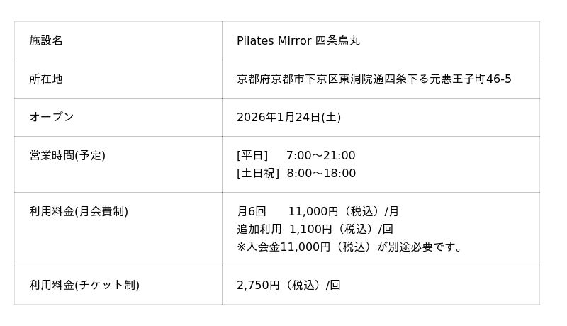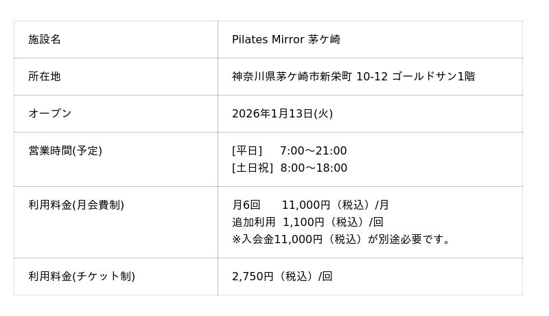コナミスポーツ株式会社(以下、「弊社」)は、天井にミラーを設置したマシンピラティススタジオ「Pilates Mirror 茅ケ崎(神奈川県茅ケ崎市)」を2026年1月13日(火)に、「Pilates Mirror 四条烏丸(京都府京都市下京区)」を2026年1月24日(土)にオープンします。