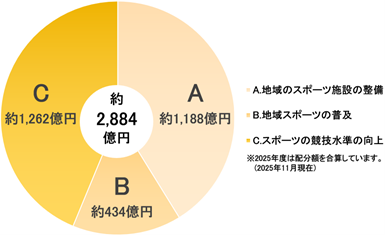 スポーツくじの収益による助成は、2002年から実施しており、これまでに約2,884億円の助成を行っています(2025年度は配分額を合算)。