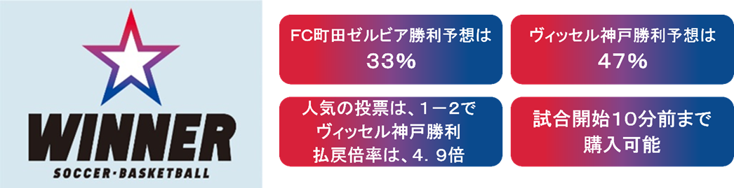 FC町田ゼルビア勝利の予想が33%※2、ヴィッセル神戸勝利の予想が47%※3、人気の投票は1-2でヴィッセル神戸勝利で、払戻倍率(オッズ)は4.9倍となっています。