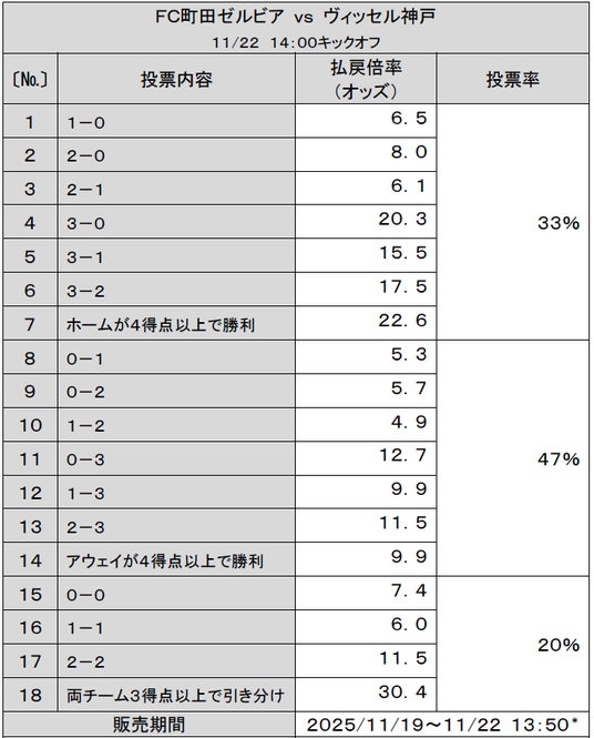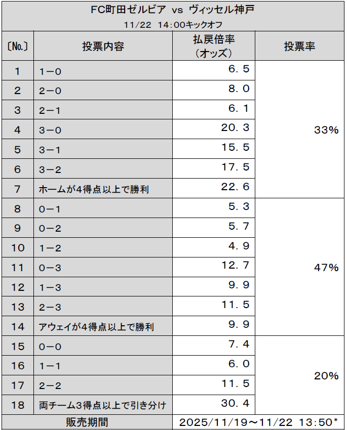 ※1 11月21日(金)10時時点の投票状況となります。払戻倍率(オッズ)は、投票状況により販売終了まで変動します。払戻倍率(オッズ)は、スポーツくじオフィシャルサイト(