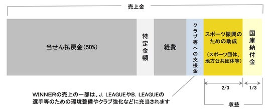 「WINNER」の売上の一部は、スポーツ振興のための助成金として活用されることに加えて、Jリーグや B.LEAGUEのクラブチームに還元され、選手等のための環境整備やクラブ強化などに充当されます。