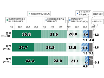 まず初の女性総理大臣誕生に対する印象。全体の約36%、特に女性は44%が「新たな期待を感じた」と回答。「日本社会の歴史的な前進を感じた」との答えも20%に上り、「女性だからこそ不安を感じた」は1.3%に留まっています。
