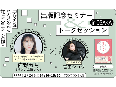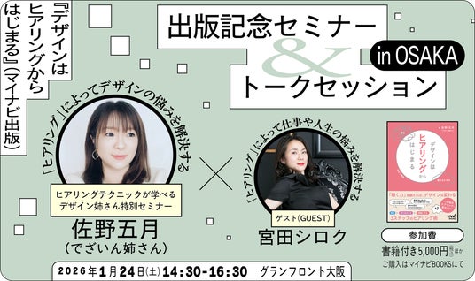 株式会社マイナビ出版(本社:東京都千代田区、代表取締役 社長執行役員:角竹輝紀)はこのたび、『デザインはヒアリングからはじまる』の発売を記念して、2026年1月24日、大阪にて著者・佐野五月さんと仕事運専門占い師・宮田シロクさんとの出版記念セミナーを開催します。