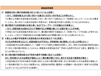 ~非認知能力の有用性・重要性への認識が一段と高まることが読み取れる結果に~ e-ラーニングに関するサービスの様々なコンテンツを提供する株式会社イー・ラーニング研究所(代表取締役:吉田智雄、本社:大阪府吹田市 以下、イー・ラーニング研究所)は、子どもがいる親世代を対象に「2025年総括『非認知能力』に関する意識調査」を実施いたしました。 その結果、7割以上の親が2024年よりも、非認知能力の必要性が高まったと回答しました。また、学校教育において非認知能力の育成を強化すべきと回答した親は9割を超え、非認知の有用性・重要性への認識が一段と高まり、注目が集まっていることが読み取れる結果となりました。=========================================================【「2025年総括「非認知能力」に関する意識調査」概要】調査方法:紙回答調査期間:2025年10月3日(金)~10月30日(木)調査対象:子どもを持つ親、親族に子どもがいる方 計307人※本リリースに関する内容をご掲載の際は、必ず「イー・ラーニング研究所調べ」と明記してください=========================================================1.保護者の約6割が非認知能力を「よく知っている」と回答!一方で、「非認知能力」から思い浮かべる能力にはばらつきがあることが明らかに。 子どもがいる親世代に「非認知能力という言葉を知っていますか?<SA>」と尋ねたところ、「よく知っている」(203)と回答した親は6割以上にのぼり、親の中での認知度の高さが明らかになりました。一方で、「聞いたことはあるが内容はよく知らない」(92)という回答も3割となり、まだ非認知能力について十分に把握ができていない層が一定数いることが読み取れる結果となりました。 また、非認知能力を「よく知っている」と回答された方に、「非認知能力と言われて思い浮かぶ能力は何だと思いますか?<MA>」と尋ねた問いでは、「協働性・コミュニケーション力」(187)が最多となり、次いで「創造力・発想力」(159)、「自己肯定感」(154)が続く結果となりましたが、どの回答も大差はなく、親の間でも非認知能力には、様々な能力が当てはまると認識していることがうかがえます。2.親が期待する非認知能力を育む場1位は「グループワークや討論などの授業」に。一方で、非認知能力を高めるうえで「情報不足」が課題と感じている親が多いことが判明! 「子どもが学校で非認知能力を育む場面として最も期待するものはどれですか?<MA>」という問いに対し、「授業(グループや討論)」(218)と回答した親が最多となり、次いで、「探究学習・課題解決型学習」(205)となりました。これらの結果から、学校の総合の時間等での、人との意思疎通や、関心分野について深堀りする経験を通じて非認知能力を成長させることが保護者から求められていることが伺えました。 次に「非認知能力を高めていく中で、どのようなことが障害になっていますか?<MA>」と伺ったところ、「非認知能力に関する情報が少ない」(255)や、「学校や授業などで高めていくカリキュラムが少ない」(208)という回答が挙がりました。このことから、いまだに非認知能力の定義が曖昧な点や、育成/評価方法が確立されていないことへの課題感が読み取れる結果となりました。3.9割以上の親が学校教育で非認知能力の育成を強化すべきと回答!子どもの将来を考える上で、非認知能力は不可欠と、学校教育に強く期待していることが明らかに! 「学校教育の中で、非認知能力が特に必要だと感じるものはどれですか?<MA>」と尋ねたところ、「自身の進路やキャリア教育」(225)が最も多く挙がり、非認知能力が一時的なものではなく、大人になってからも社会で生きていくために必要な力だと考えている親が多いことがうかがえました。また、「今後、学校教育において非認知能力の育成を強化すべきだと思いますか?<SA>」という問いに対し、「強化すべき」(288)と回答した親は9割以上となり、“将来にも活用できる力”と捉え、学校での非認知能力育成を重要視していることが明らかになりました。4.約9割の親が非認知能力は「将来の進学や就職に役立つ」と回答!また、昨年度からその必要性が増加したと7割の親が感じており、変化する社会で重要性が増大! 「非認知能力の育成が「将来の進学や就職に役立つ」と思いますか?<SA>」と尋ねたところ、「強く思う」(203)と「思う」(91)の回答を合わせて9割以上の親が非認知能力に対して肯定的に捉えていることが推測されます。また、「昨年(2024年)と比べて、非認知能力の必要性を感じる場面は増えましたか?<SA>」という問いに対しては、「増えたと感じる」(216)と回答した親は7割以上にのぼり、非認知能力の重要性と有用性を認識する親が増加していることから、社会が刻一刻と変化する中で、その重要性はますます増大していることがうかがえる結果となりました。【『子ども未来キャリア』概要】『子ども未来キャリア』は、子どものときから夢や目標を持ち、グローバル社会で必要となる知識と能力を育
