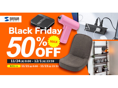 サンワサプライ株式会社(本社:岡山市北区田町1-10-1、 代表取締役社長 山田 和範)が運営するサンワダイレクト Amazon店は、Amazonで11月21日(金)0時から11月23日(日)23時59分まで開催される「ブラックフライデー 先行セール」及び、11月24日(月・休)0時から12月1日(月)23時59分まで開催される「Amazon ブラックフライデー」において1636商品が最大50%OFFになるタイムセールを開催いたします。