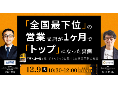 “次の一手”がデータでわかるMA+SFA一体型ツール「Kairos3(カイロススリー)」を提供するカイロスマーケティング株式会社(本社:東京都渋谷区、代表取締役:佐宗 大介、以下「当社」)は、株式会社Goldratt Japanとの共催で、オンラインセミナー「『全国最下位』の営業支店が1ヶ月で『トップ』になった裏側 『ザ・ゴール』流 ボトルネックに集中した営業革新の極意」を開催いたします。
