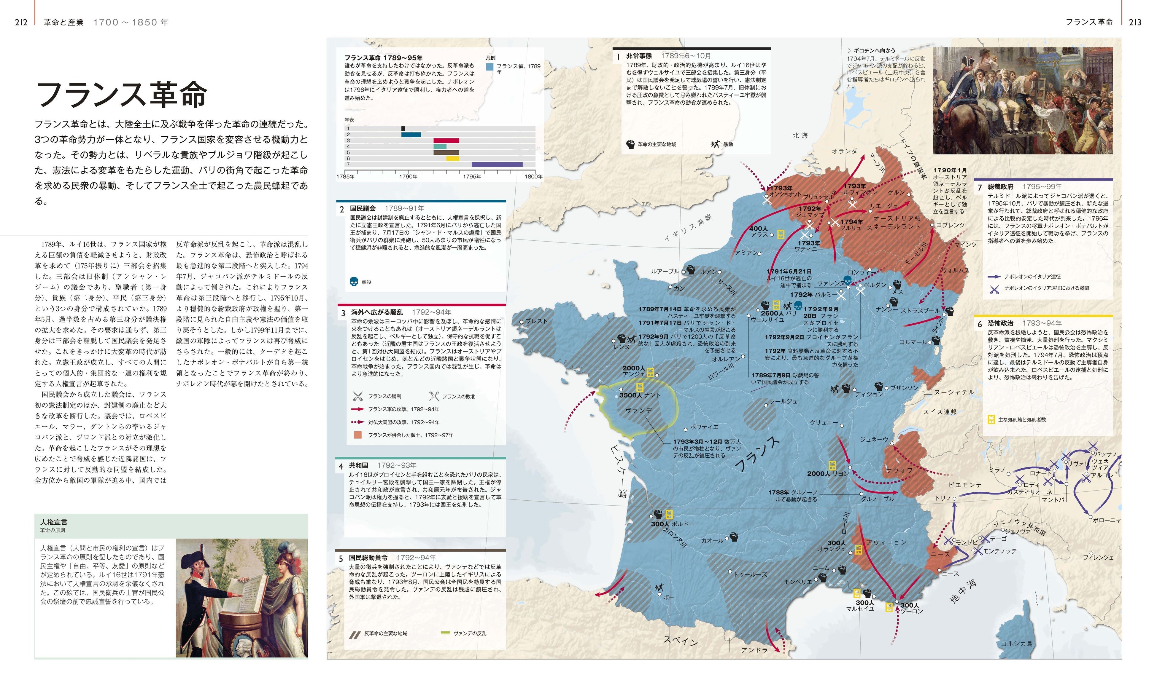 西欧はもちろん、アジア、アフリカ、アメリカ、オセアニアなどの文化や動向までを押さえた、世界史上の重要で興味深い約130のテーマを、グラフィカルな地図をメインに用いて時系列で配置しているため、全世界の歴史の流れと文化の多様性が自然に統合されながら理解できるよう工夫されています。