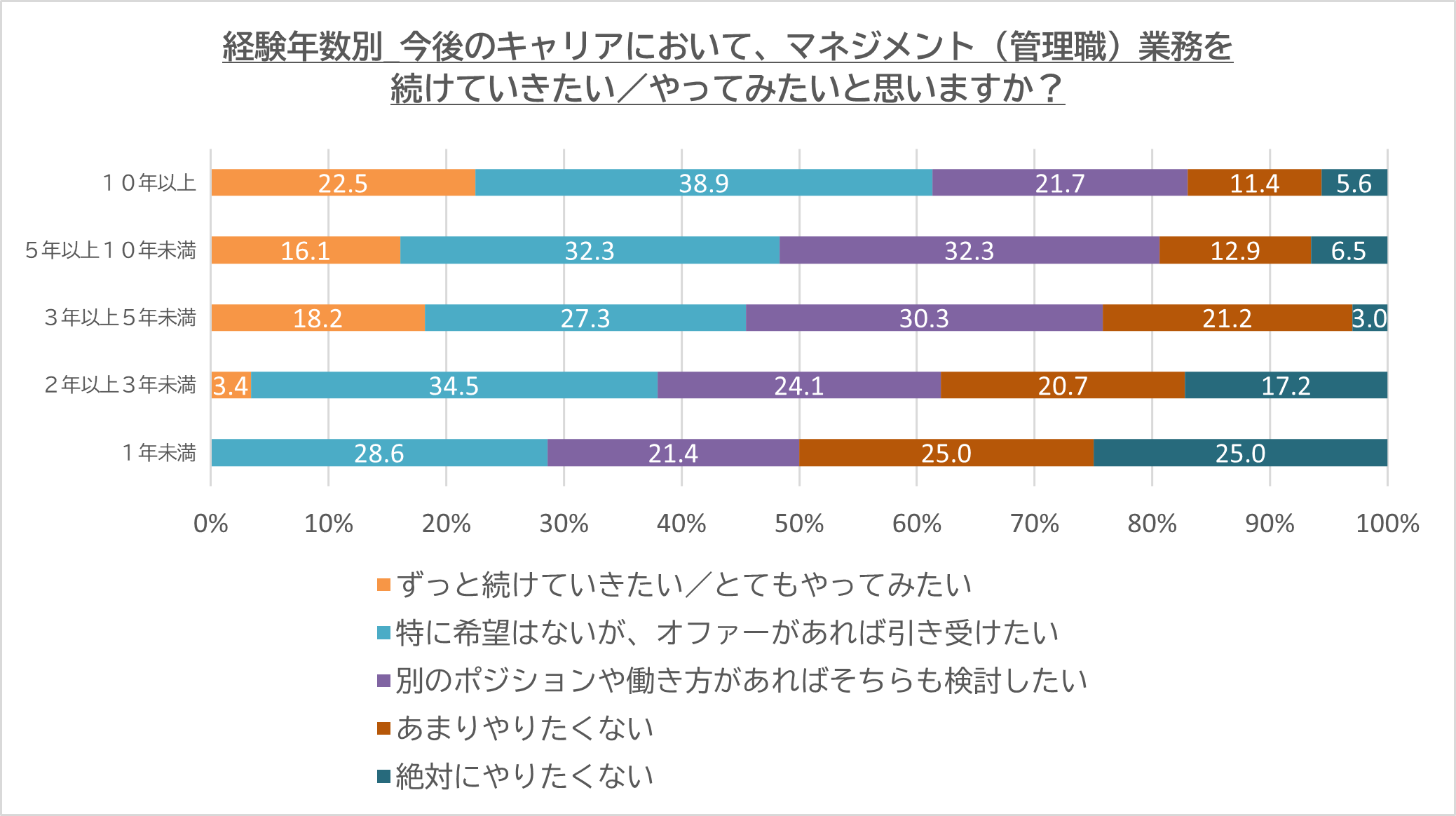 経験年数別に見てみると、経験を重ねるほどマネジメント職へのポジティブ回答の割合が増え、ネガティブ回答が減少していくことがわかりました。得意業務を経験年数別に見てみたときにわかったように、経験を積むことで現場マネジメント能力は着実に伸び、5年を超えると全体的にスキルが伸びてバランスの良いマネジメントを行うことができています。現場における成長実感を通じてやりがいが醸成され、役割の安定が高まり、管理職を続けたいと感じる傾向が高まると考えられます。