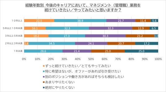 経験年数別に見ると、年数が増えるにつれてポジティブ度は上昇する傾向が明らかに。マネジメント職を継続するほど成長実感を得られるか