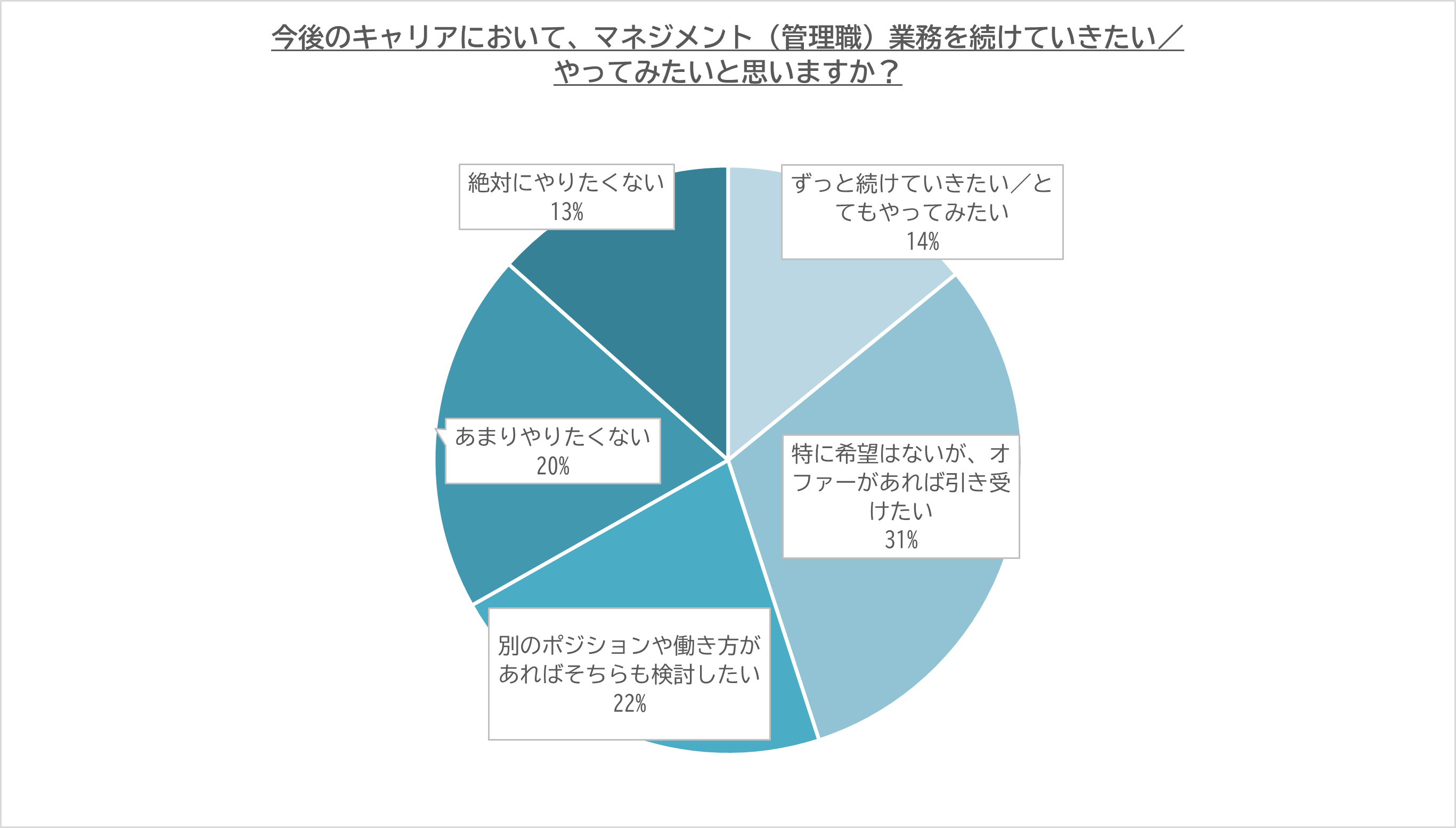 今後もマネジメントを希望するかどうかを問うた設問では、約45%から前向きな回答を得ました。また、「別のポジションや働き方があればそちらも検討したい」が約20%となり、現在マネジメント職に従事していても、柔軟にポジションや役割変化を臨む声も一定数あることがわかります。一方で「あまりやりたくない・絶対にやりたくない」回答は約33%となり、マネジメント職の経験を経た上で自身には向いていないと判断している層が3割強いることも明らかとなりました。
