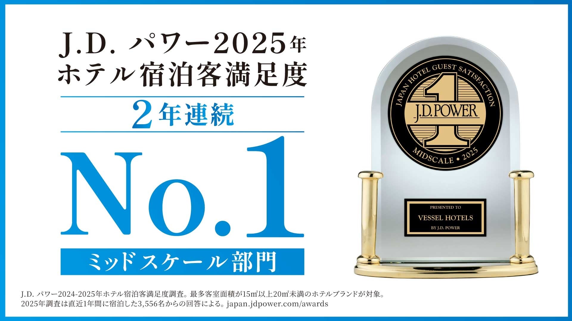 「あなたと家族と街を愛する。」をビジョンに、全国でホテル事業を展開する株式会社ベッセルホテル開発(本社:広島県福山市南本庄三丁目4番27号、代表取締役社長:瀬尾 吉郎(せお よしろう)、以下ベッセルホテルズ)が運営するベッセルホテルズ(「ベッセルホテルカンパーナ」「ベッセルホテル」「ベッセルイン」「REF by VESSEL HOTELS」の4ブランドが評価対象)は、2025年11月20日(木)、株式会社J.D. パワー ジャパン(本社:東京都港区、最高経営責任者:木本 卓(きもと たく)、以下J.D. パワー)が発表した「J.D. パワー2025年ホテル宿泊客満足度調査(SM)」の<ミッドスケールホテル部門>において、顧客満足度第1位を2年連続で受賞しました。特に「料金」において高い評価をいただきました。