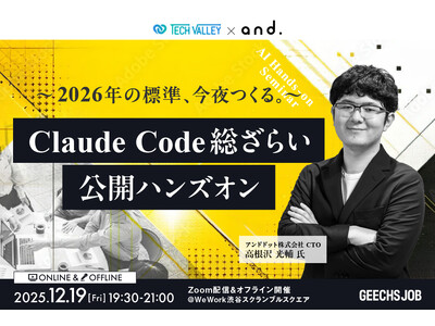ギークス株式会社(本社:東京都渋谷区、代表取締役CEO:曽根原 稔人、以下ギークス)は、2025年12月19日(金)19:30~21:00にて、ITエンジニア向けの無料セミナー「Claude Code総ざらい・公開ハンズオン ~2026年の標準、今夜つくる。~」を開催します。