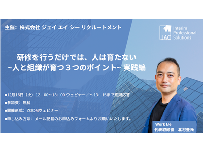 世界11ヵ国で人材紹介事業を展開する業界大手の株式会社ジェイ エイ シー リクルートメント(代表取締役会長兼社長:田崎ひろみ、以下JAC)は、2025年12月16日(火)12:00より、年間50社以上人事コンサルティングと人材育成事業を展開している北村豊氏を講師に迎え、JAC Interim Professional Solutions seminar『研修を行うだけでは、人は育たない~人と組織が育つ3つのポイント~』実践編を開催します。参加は無料です。