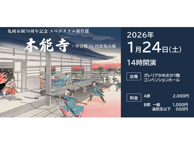 京都府亀岡市(市長:桂川孝裕)ら市内観光事業者等でつくる、亀岡光秀まつり実行委員会(実行委員長:奥村昌信)は、亀岡市制70周年記念事業とし、亀岡市の文化・芸術を発信するため、スペクタクル新作能『本能寺』を制作、令和8年1月24日(土)にガレリアかめおかで上演します。