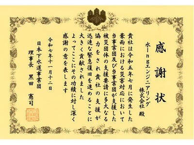 本感謝状は、2023(令和5)年7月に発生した線状降水帯発生に伴う豪雨災害において、水ingエンジニアリングが山口県美祢市内の施設(美祢市浄化センター)の浸水被害に対して、迅速な復旧対応(汚泥脱水設備、脱臭設備、用水設備等における浸水被害の確認など)に貢献した功績が称えられ、授与されたものです。