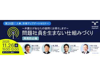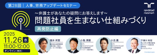総合人材サービスを提供するランスタッド株式会社(本社:東京都千代田区 代表取締役会長兼CEO 道上 淳之介、代表取締役社長 猿谷哲)は、2025年11月26日(水)11:00~12:00に、問題社員を生まない組織づくりにおける「再発防止編」の重要性について学ぶオンラインセミナーを開催いたします。