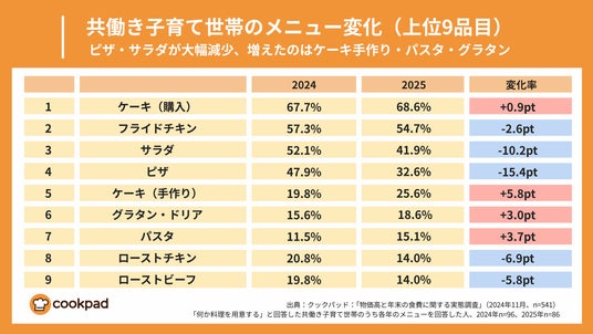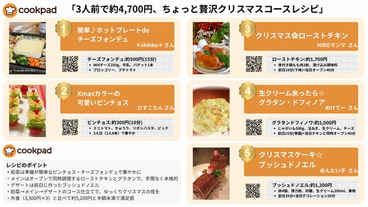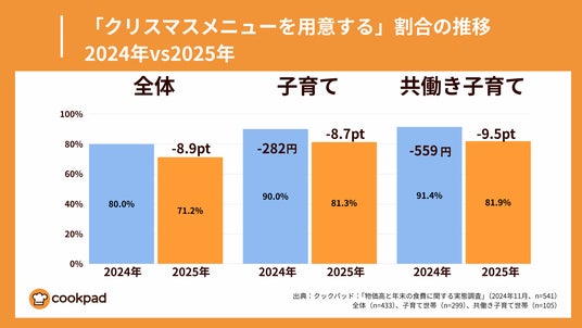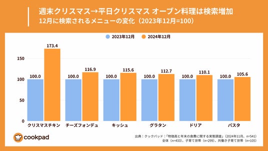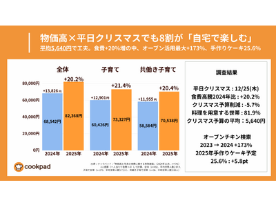 利用者数No.1レシピサービス「クックパッド」を運営するクックパッド株式会社は、普段料理を作る人を対象にクリスマスと食費に関する実態調査を実施しました(n=541、うち共働き子育て世帯105人)※1。2025年は2年連続の「平日クリスマス」(12/25木曜)。物価高で月の食費が約20%増加する中、クリスマス費用は平均5,640円(世帯平均2.99人、前年比-5.7%)。それでも共働き子育て世帯の81.9%は「何らかの料理を用意する予定」と回答しました。手作りケーキが25.6%(前年比+5.8pt)に増加し、2023年12月(週末クリスマス)と2024年12月(平日クリスマス)の検索データ※2比較では「クリスマスチキン」+73.4%、「グラタン」+16.9%と、オーブンを活用した時短メニューが急伸。2025年も同様の傾向が予想されます。