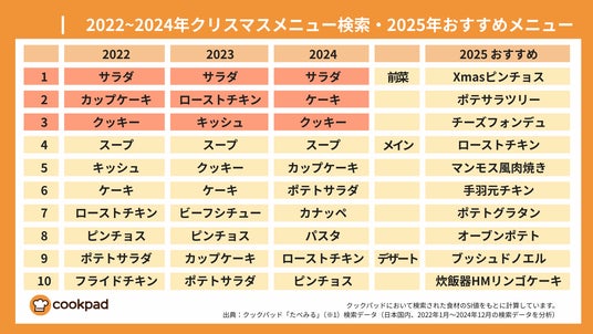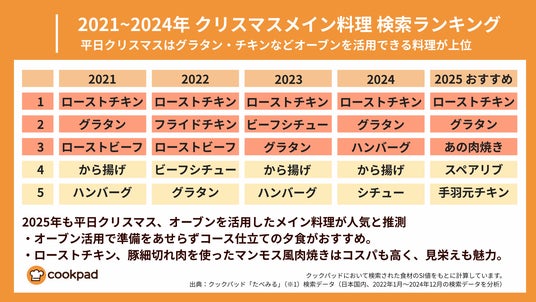 クックパッドの検索データ(※2)で、2021年~2024年のクリスマスメニュー検索ランキングを見ると、クリスマスの曜日と物価状況によってメイン料理の選択が大きく変化しています。