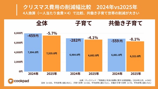 クリスマス費用は、全体で5,984円から5,640円へ343円減少(-5.7%)。子育て世帯では6,492円から6,229円へ263円減少(-4.1%)と削減幅が小さい一方、共働き子育て世帯では6,414円から5,893円へ521円減少(-8.1%)と削減幅が最も大きくなっています。