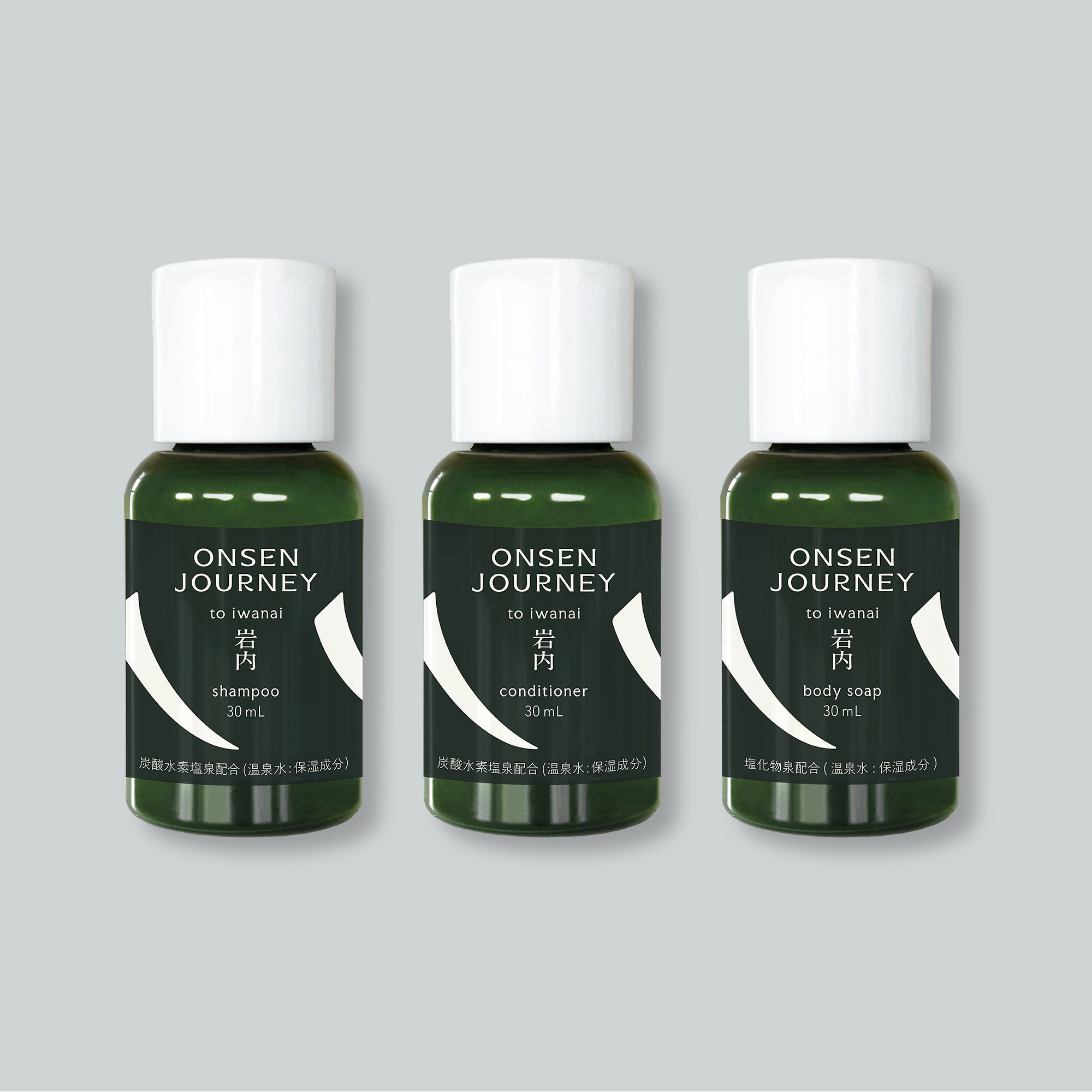 アメニティ(画像はイメージです) “いわない温泉水”を配合した温泉アメニティサンプル(ボディソープ/シャンプー/コンディショナー)を進呈します。今後は、ご利用者にはアンケートを行い、商品開発を進めていく計画です。温泉タオルを片手にまち歩きを楽しみ、旅のあとも髪と肌を整えながら、いわない温泉の余韻を日常でも感じていただけます。