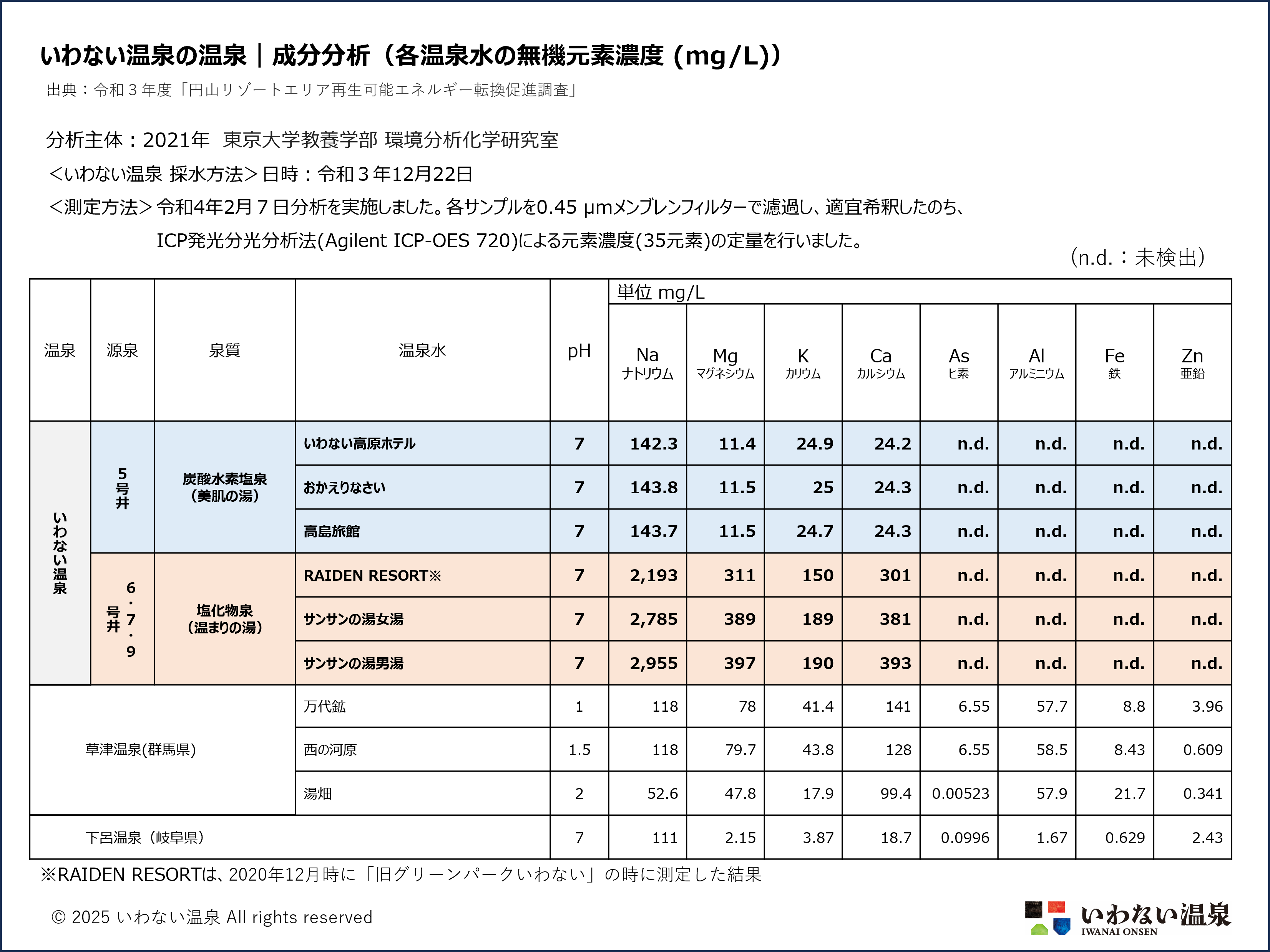 炭酸水素塩泉である「美肌の湯」は、美容分野で知られるアベンヌ温泉水がもつMg(マグネシウム)とCa(カルシウム)のバランスに近い値を示している。さらに、源泉かけ流しで提供されているため成分純度が高く、科学的にも優位性が認められています。Na(ナトリウム)、Mg(マグネシウム)は、草津温泉・下呂温泉など日本を代表する名湯と比較しても非常に高いミネラル濃度を有しており、血液循環の促進、組織への酸素供給の増加、有害物質の排出(デトックス)を助け、疼痛の軽減や神経の緊張緩和にもつながることが期待できます。また、いずれの温泉も、高温の源泉かけ流しで純の温泉ですが、生体にとって有害物質が検出されていません。