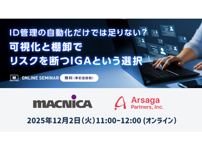 企業のDXを促進するアルサーガパートナーズ株式会社(本社:東京都渋谷区、代表取締役会長兼CTO:小俣泰明、代表取締役CEO:渡邉純平、以下「アルサーガパートナーズ」)は、2025年12月2日(火)11:00~12:00に開催される株式会社マクニカ主催のオンラインセミナー「ID管理の自動化だけでは足りない?可視化と棚卸でリスクを断つIGAという選択」に、当社コンサルティング本部 シニアマネージャーの 石黒元洋 が登壇することをお知らせいたします。