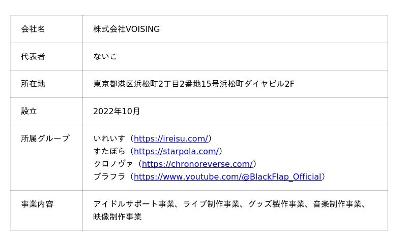 株式会社VOISING(本社:東京都港区、代表者:ないこ)は、新グループとして6名からなる「ブラフラ(BLACK FLAP)」のデビューを正式発表いたしました。ブラフラは、「傷ついた翼でも、高く飛べる証明を。」 をキャッチコピーに掲げ、これまでに大きな挫折や失敗を経験した6人が、“もう一度本気の挑戦がしたい”という強い想いのもと集結したグループとなっております。