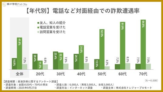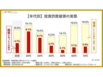 オンライン株式スクール「株の学校ドットコム」(運営会社:株式会社トレジャープロモート、東京都千代田区、代表取締役社長:瀬川 丈)は、全国の20代~70代の6000人に投資詐欺被害の実態調査を行いました。実際に投資詐欺の被害にあったことがあると回答した人は20代で9.1%にのぼり、他の年代と比べて飛びぬけて高くなりました。