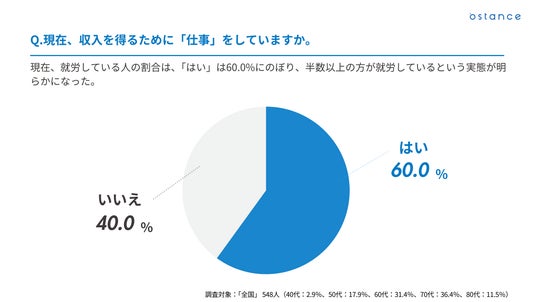 - 現在、「仕事」をしているシニアは、全体の60.0%を占めた。