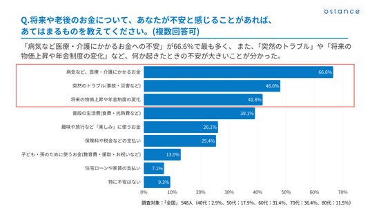 「病気など医療・介護にかかるお金への不安」が66.6%で最も多く、 また、「突然のトラブル」や「将来の物価上昇や年金制度の変化」など、何か起きたときの不安が大きいことが分かった。