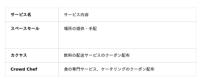 株式会社スペースモール(本社:東京都渋谷区、代表取締役:小泉直弥、以下 スペースモール)は、酒類・飲料などの総合流通事業を展開する株式会社カクヤス(本社:東京都北区、代表取締役社長:佐藤順一、以下 カクヤス)および、出張シェフサービス「Crowd Chef」を提供する株式会社アイドマ・ホールディングス(本社:東京都品川区、代表取締役:三浦 陽平、以下 アイドマ・ホールディングス)と共同で、レンタルスペースを活用した新たな連携パッケージプランを開始したことをお知らせします。