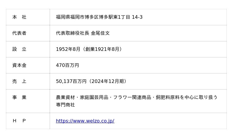 食・農業を通して、持続可能な社会と人々の暮しを豊かにする商品やサービスを提供する、農業資材・家庭園芸用品・フラワー関連商品・飼肥料原料を中心に取り扱う専門商社です。2022年で創業 101 年を迎えたニチリウ永瀬は、2023年1月1日をもって、「株式会社welzo」に社名を変更。BtoB を中心としたビジネススタイルを築き、国内に24拠点を置いています。 社内外のビジネスパートナーと共創し、ITやAIの技術を活用しながら、日本が直面する課題にも積極的に取り組んでいます。