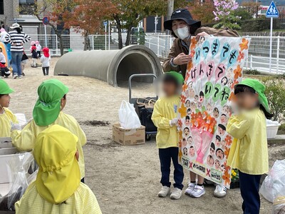 当日の活動までに、それぞれが前回の寄せ植えで育てたお花を使い、再び会える日を心待ちにしてプレゼントを制作しました。当日は、マナハウス入居者が押し花しおり、園児が花をモチーフに描いた大きな花の絵を、互いに贈り合いました。会場では、互いの顔を見つけた瞬間にパッと笑顔が広がり、「前にも一緒に植えたよね!」「今日はこれ作ってきたよ」と自然に言葉がこぼれました。寒い朝でしたが、嬉しい笑顔や得意げな笑顔とありがとうの言葉が飛び交っていました。