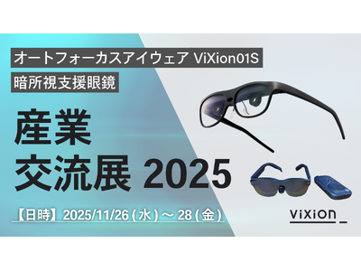 オートフォーカスアイウェア「ViXion01S」を開発・販売するViXion株式会社(東京都中央区、代表取締役社長:南部誠一郎、以下ViXion)は、2025年11月26日(水)から11月28日(金)に東京ビッグサイトで開催される「産業交流展2025」に出展し、最新テクノロジー技術を活用した2つの視覚支援デバイス「オートフォーカスアイウェア ViXion01S」、および「暗所視支援眼鏡(新モデル)」のプロトタイプを展示します。
