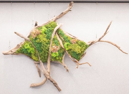 執務エリアには、株式会社日比谷花壇※3との協業による、流木とフェイクグリーンを組み合わせたオリジナルアートを設置しました。自然素材の有機的なラインで描かれた造形は、建物名「アルカサル(Alcazar)」の頭文字“A”をモチーフにデザインしています。