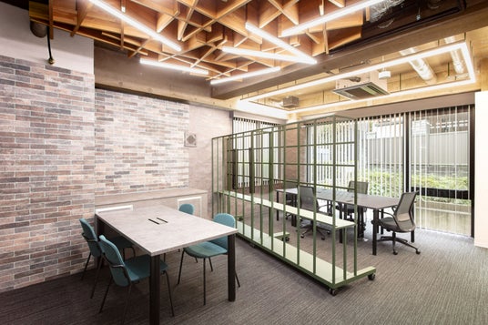 天井・壁・床の仕上げ材を全面的に刷新し、特に打合せエリアは「デザイン性優先エリア」として位置づけ、木の天井造作と壁面レンガタイルを設置しました。木造作は「アルカサル(Alcazar)」の頭文字“A”(アルファベットの始まりの文字)をモチーフにし、スタートアップがここから新たな挑戦を始め、成長していく“はじまりの場所”であるという思いを込めています。