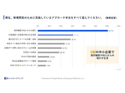 「紹介」を主力とする企業の約6割が「明確なKPIなし」かつ「ほぼ手動」で新規開拓を実施。戦略的なマネジメントと営業DXの遅れが明らかに。株式会社ラクス(本社:東京都渋谷区、代表取締役:中村 崇則)が提供するメールマーケティングサービス「楽楽メールマーケティング」は、Sansan株式会社(本社:東京都渋谷区、代表取締役社長:寺田 親弘)が提供する中小企業向け名刺管理サービス「Eight Team」と共同で、BtoB中小企業に勤める営業マネージャー300名を対象に「中小企業の新規開拓に関する実態調査」を実施いたしました。本調査の結果、5割以上の企業が新規開拓手法として「既存顧客や知人からの紹介」を最も成果が出ており、実践している手法として回答。しかしながら、「紹介」を主力とする企業のうち約6割が、新規開拓業務の評価指標について「明確なKPIはない」、また営業活動を「ほぼ手動で行っている」と回答し、全体平均を大幅に上回る結果となりました。高成果の手法があるがゆえに、戦略的な目標設定やデジタル化が遅れているという、中小企業が抱える「ジレンマ」が浮き彫りになりました。トピックス- 新規開拓手法として「既存顧客や知人からの紹介」を実施していると回答した企業は60.7%。最も成果に繋がる手法としても「紹介」に集中(52.0%)。- 「紹介」を主力とする企業の過半数(59.0%)が新規開拓業務の評価指標について「明確に設定された指標(KPI)はない」と回答。全体平均(39.0%)より大幅に高い。- 「紹介」を主力とする企業に限定すると61.5%が、新規開拓を「ほぼ手動で行っている」と回答。全体平均(42.0%)より約20pt高く、紹介依存とアナログ営業の相関が見られる結果に。- すぐに商談化しない見込み客への継続的なアプローチについて、「特に行っていない」と回答(40.7%)。獲得した接点を活かせておらず、機会損失につながっている状況。調査概要調査結果