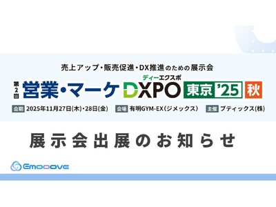 新時代の営業手法を提案する株式会社Emooove(本社:東京都渋谷区、代表取締役CEO:藤澤諒一)は、2025年11月27日(木)・28日(金)に有明GYM-EXで開催される「第2回 営業・マーケDXPO東京'25【秋】」に出展いたします。