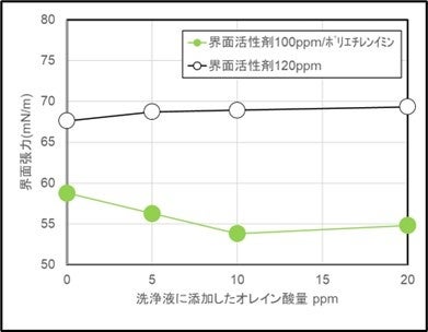 さらにポリエチレンイミンのエチレンオキシド付加体は界面活性剤と複合体を形成することで、オレイン酸(皮脂汚れの成分)の界面張力を低下させて(図4)、衣類から取り除きやすくし、界面活性剤が少なくても高い洗浄力を発揮します。