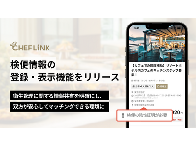 これにより、応募時点で検便要件と検査状況が明確となり、マッチング後の確認作業を軽減。事業者・シェフ双方が衛生面で安心してやり取りできる環境を実現します。