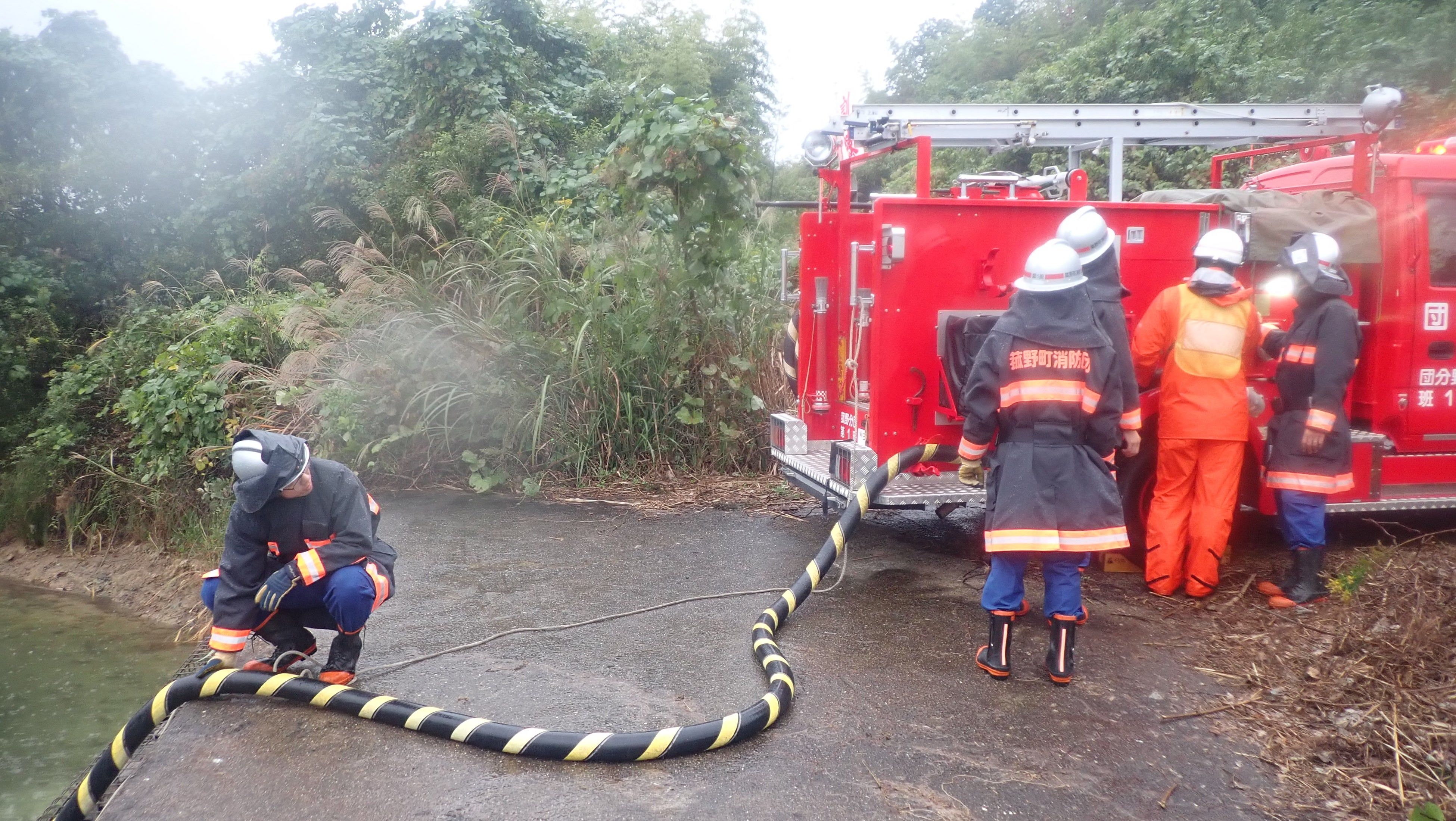 たき火が延焼して林野火災が発生したという想定のもと、通行人による119番通報・初期消火・消防隊への情報提供など初動体制の確認を行い、菰野調整池から消防団車両による揚水、遠距離中継送水、湖面に向けた放水訓練及びジェットシューターを使用した消火訓練を実施しました。