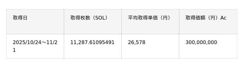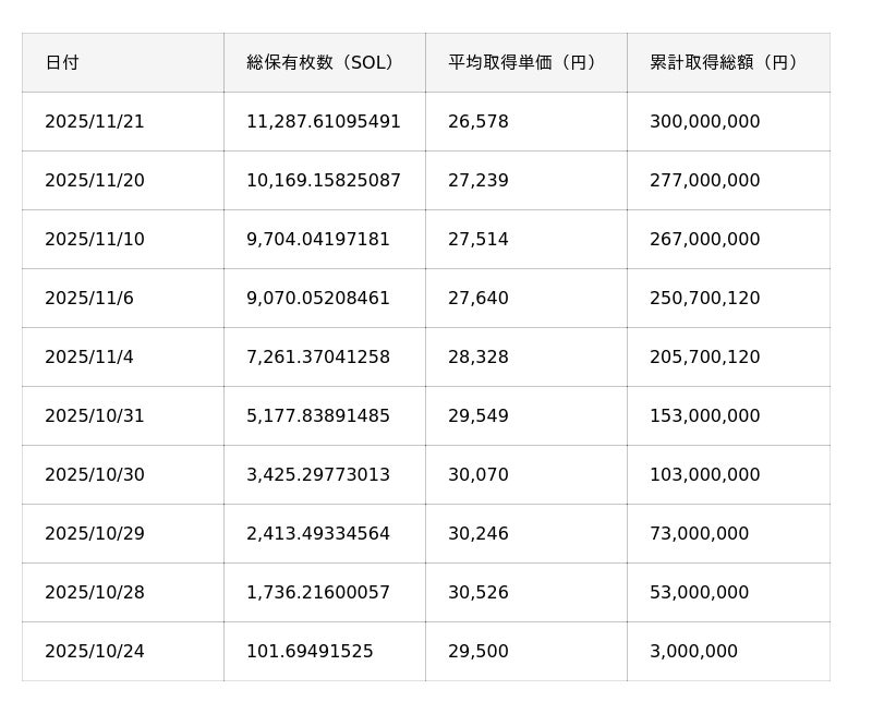 その結果、取得開始以降も継続的に取得を進め、累計取得額は 3 億円規模へと達し、保有量は 10,000 SOL を超えたことをお知らせいたします。