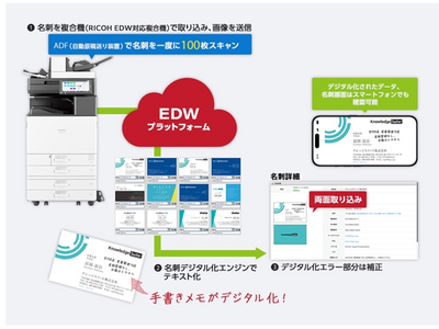 本機能により、名刺サイズに対応したADF(自動原稿送り装置)を搭載したリコー新機種複合機において、名刺の表面・裏面を一度に最大100枚までスキャンし、『Knowledge Suite(ナレッジスイート)』へ一括で取り込みできるようになりました。名刺に記載されている手書きのメモも取り込むことが可能です。